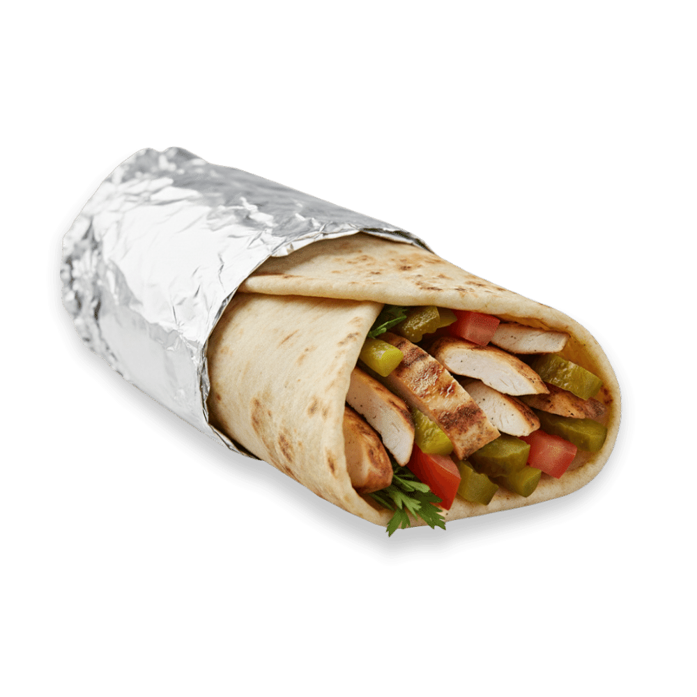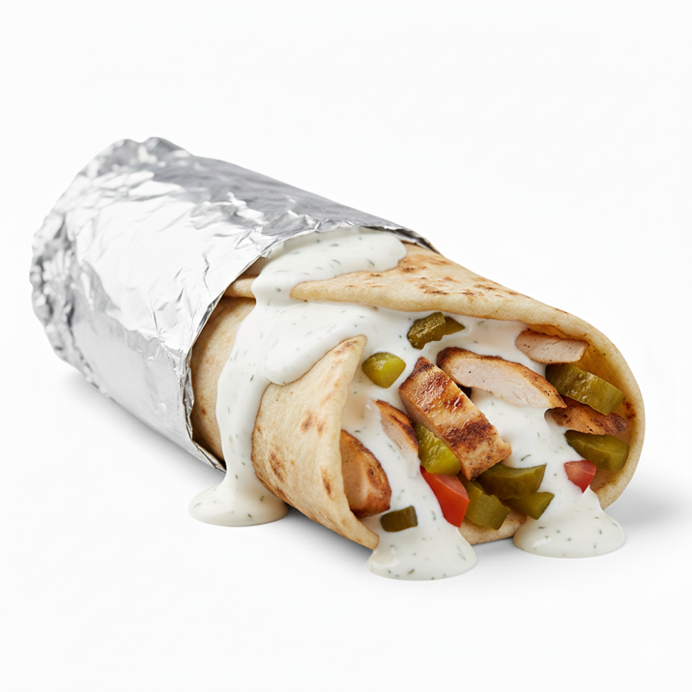 Тортилья, соус "Ранч", огурец маринованный, лук маринованный, сыр моцарелла, курица, томат.