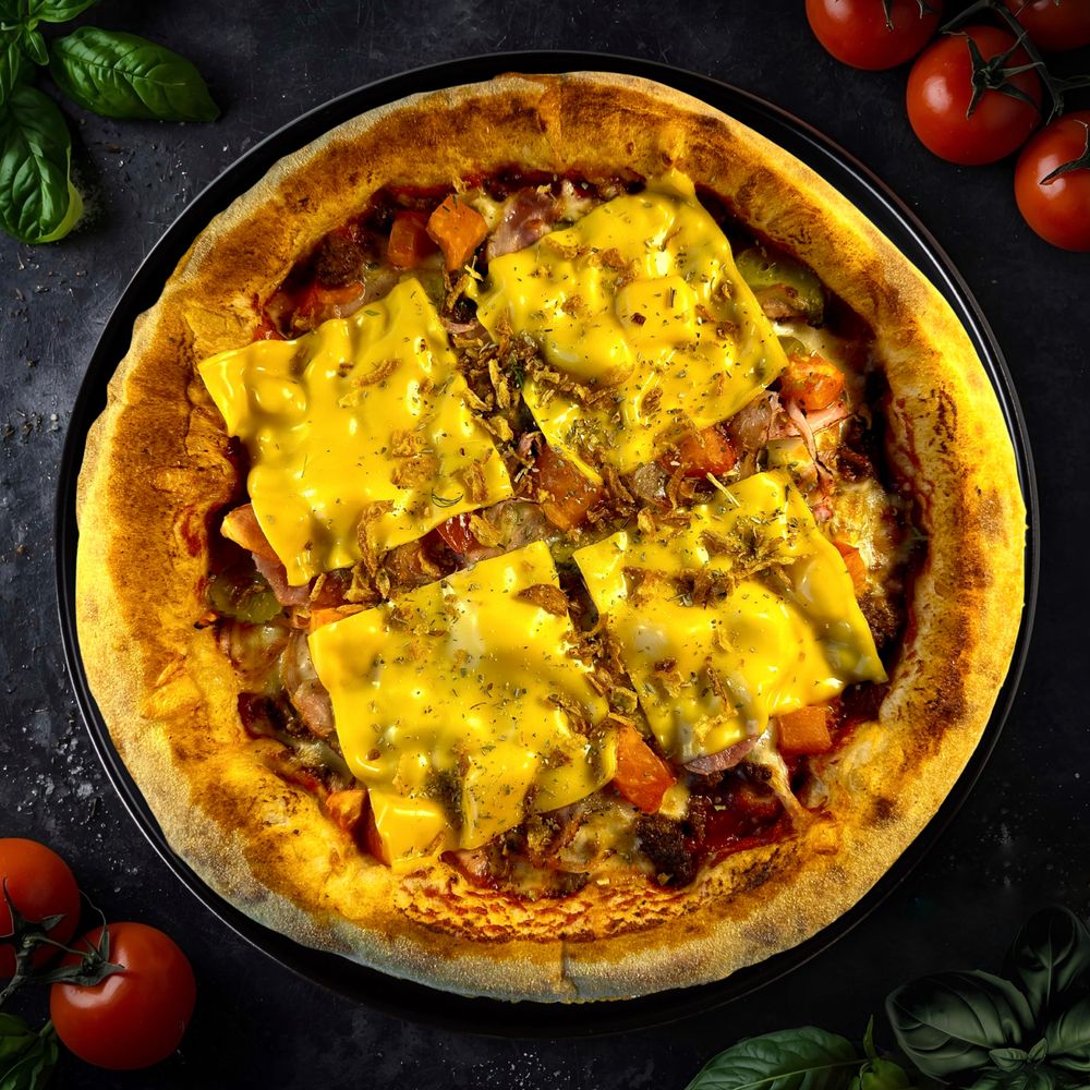 Томатная основа,фарш говядина,огурец маринованный,лук маринованный,томат свежий,бекон,сыр чеддер,сыр моцарелла,хрустящий лук,орегано.