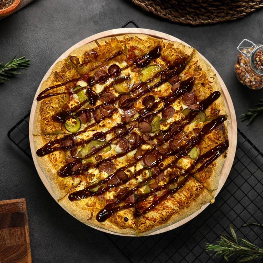 Томатная основа, сыр моцарелла, колбаски, огурцы маринованные, сыр брынза, соус "Барбекю".