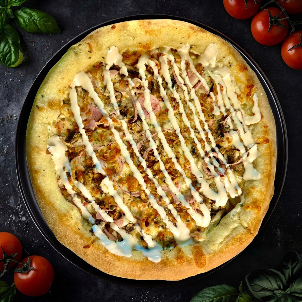 Соус "Ранч",шампиньоны,курица,маринованный лук,сыр моцарелла,грибной соус,хрустящий лук,орегано.