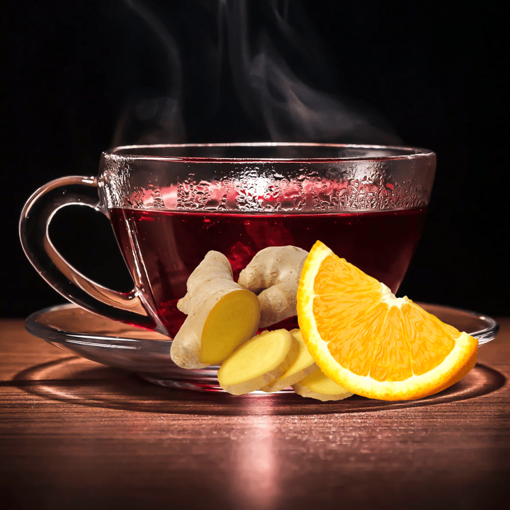 Чай на основе пюре из апельсина, лайма, лимона и имбиря, с добавлением мёда натурального, мяты и сахара.