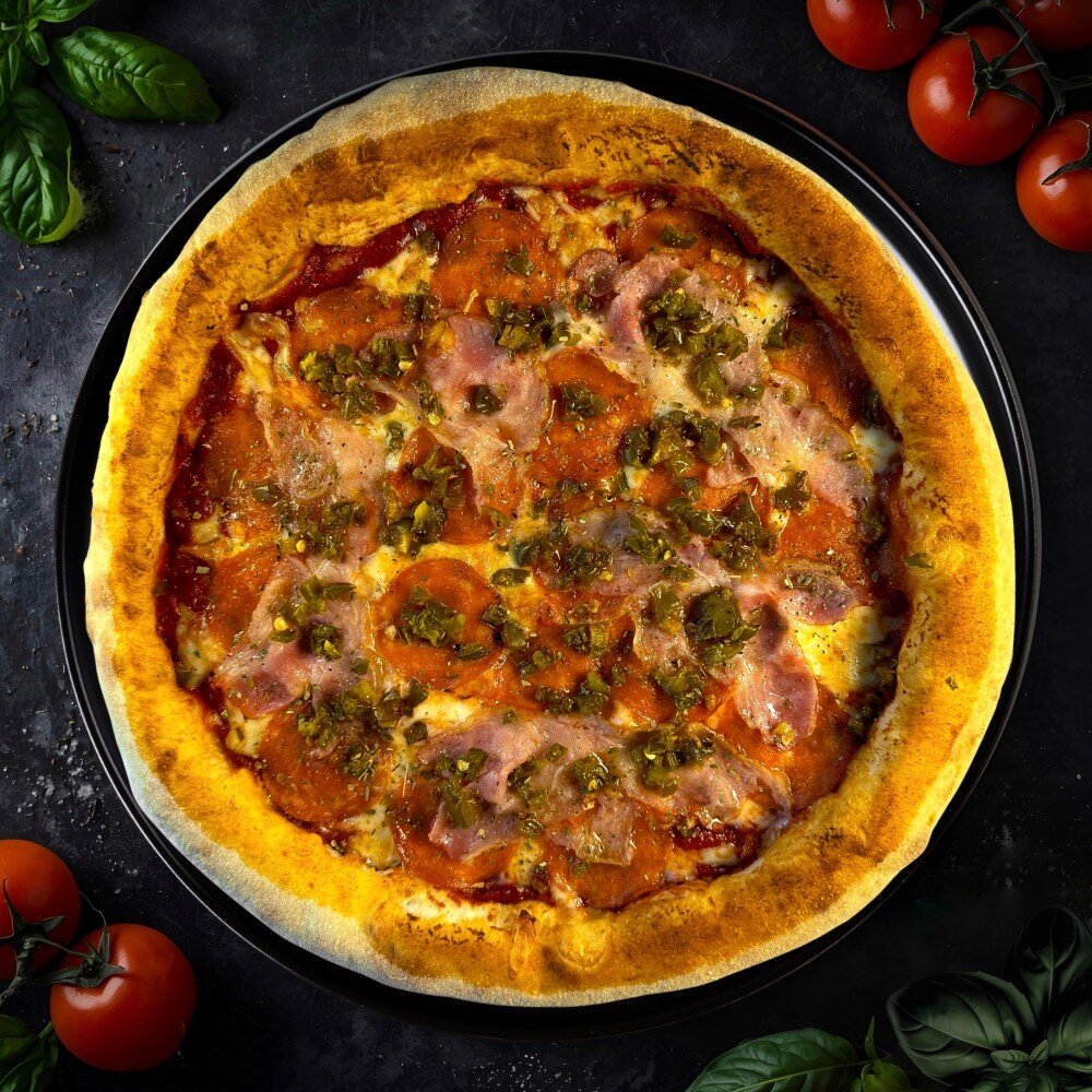 Томатная основа,пепперони,бекон,сыр моцарелла,перец халапенью,орегано.