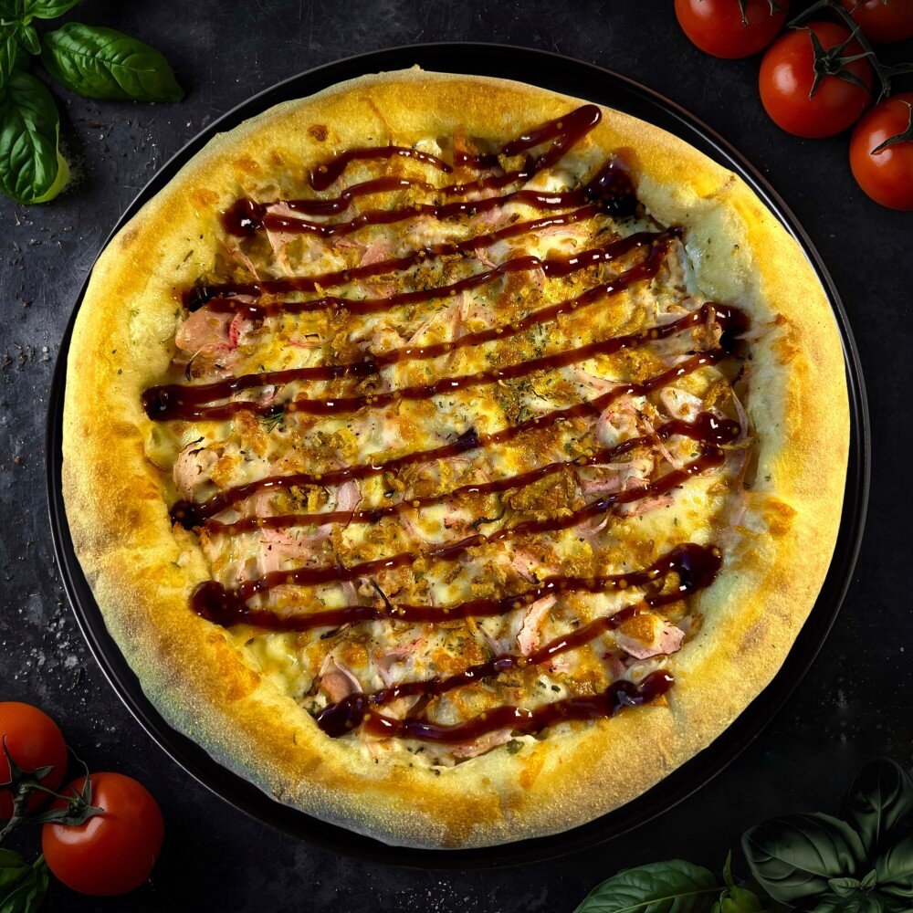 Соус "Ранч",курица,ветчина,сыр моцарелла,маринованный лук,соус "Барбекю",хрустящий лук,орегано.