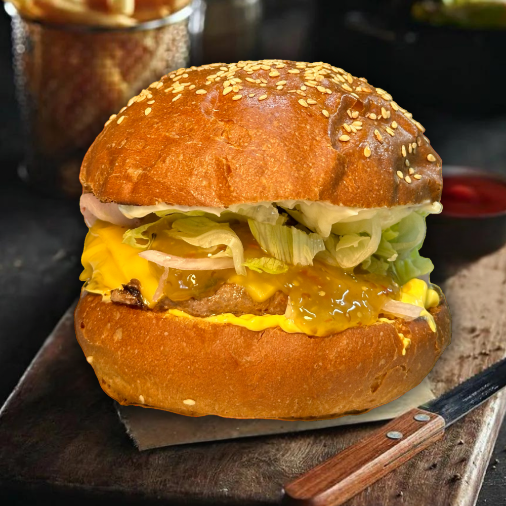 Котлета из говядины,салат айсберг, тройной сыр чеддер, маринованные огурцы,лук маринованный,соус сырный,фирменный соус.