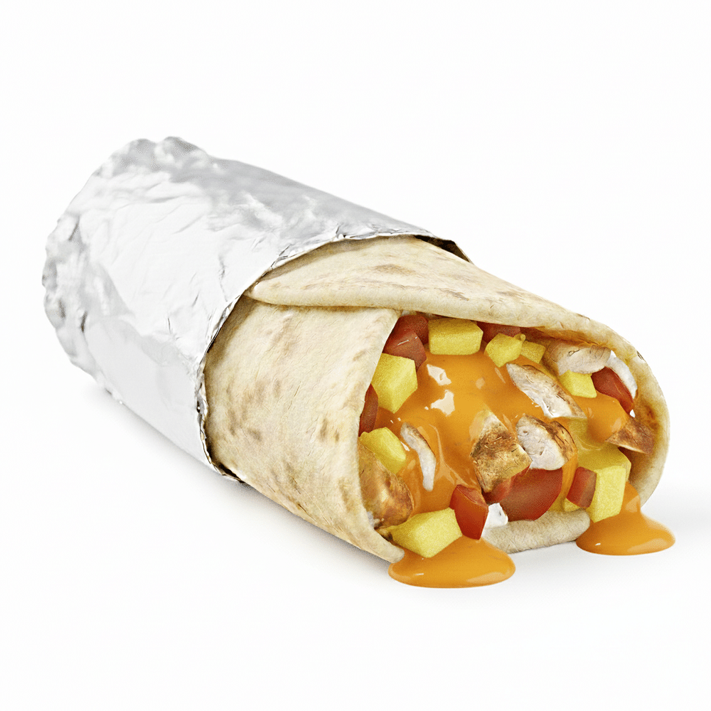 Тортилья, соус "Ранч", соус "Карри", сыр моцарелла, ананас, курица, томат.