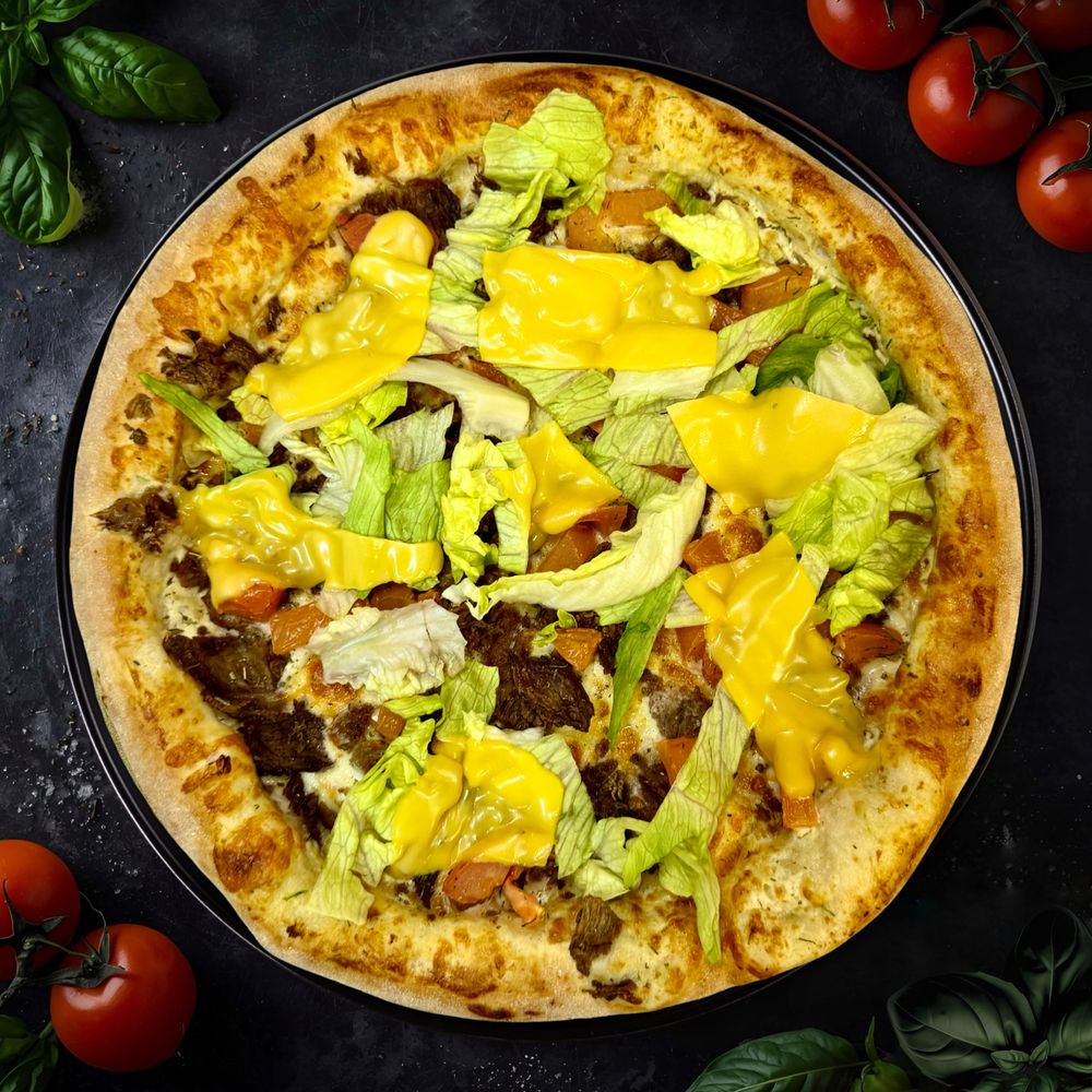 Соус чесночный, рваная говядина, сыр моцарелла, томат, сыр чеддер, салат айсберг, лук фри.
