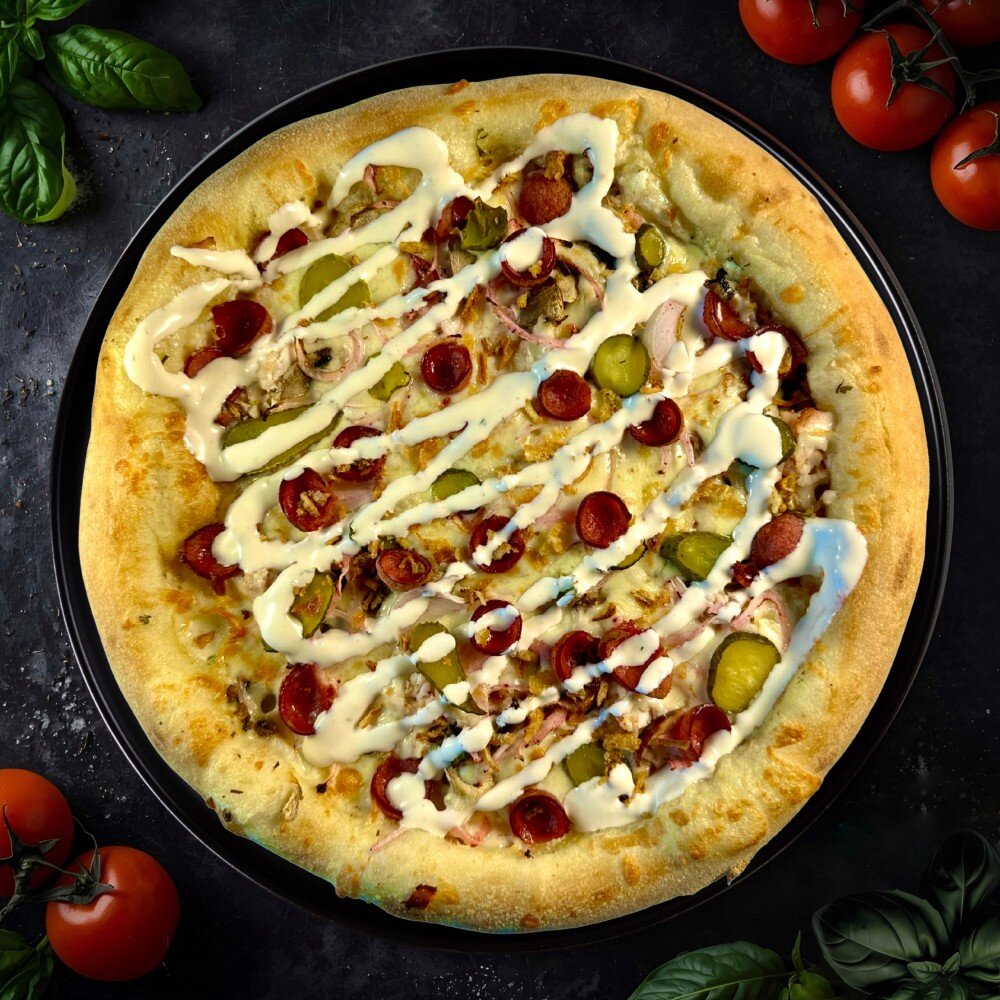 Соус "Ран",шампиньоны,курица,маринованный лук,маринованный огурчик,сыр моцарелла,охотничьи колбаски,грибной соус,орегано,хрустящий лук.